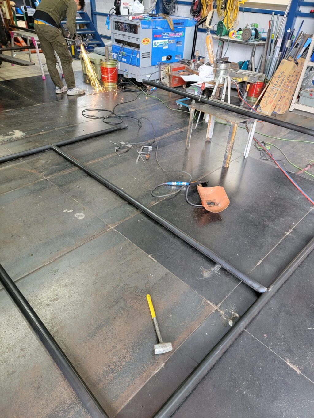 パイプの縦横ジョイント部は展開を作成し、それを下地に墨を入れガス切断した後サンダーで面を綺麗に研磨します。